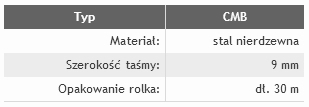- CMB to stalowa taśma nierdzewna o szerokości 9 mm, nawinięta na rolkę o długości 30 m. Odpowiednio ukształtowane krawędzie zapobiegają uszkodzeniu przewodów elastycznych podczas zakładania. Taśma rozwijana jest z wygodnych plastikowych opakowań. Umożliwia szybkie złożenie opaski zaciskowej na dowolną średnicę poprzez zastosowanie zamka zaciskowego CMC. Taśma metalowa CMB w rolce stanowi ekonomiczny, wygodny i szybki sposób tworzenia opasek zaciskowych. Sposób wykonania opaski zamieszczony jest na opakowaniu taśmy.